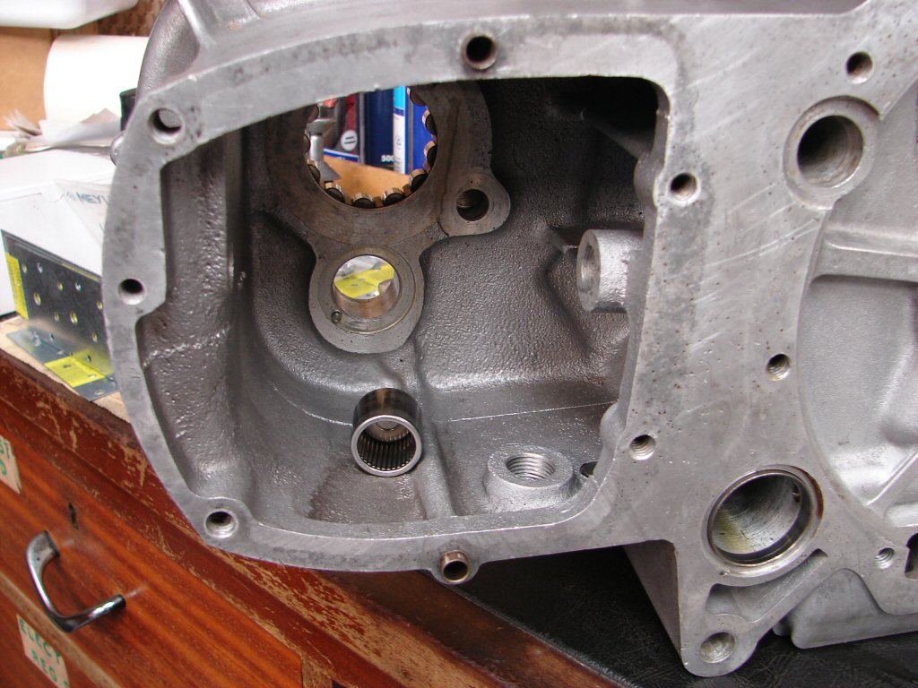 For the same reasons as above, the inner case got nipped up without final tightening while I fitted the oil pump drive gears to ensure it all meshed as it should. After that the outrigger bush which supports this end of the cross shaft went on so that there were no surprises when it gets its final tighten.