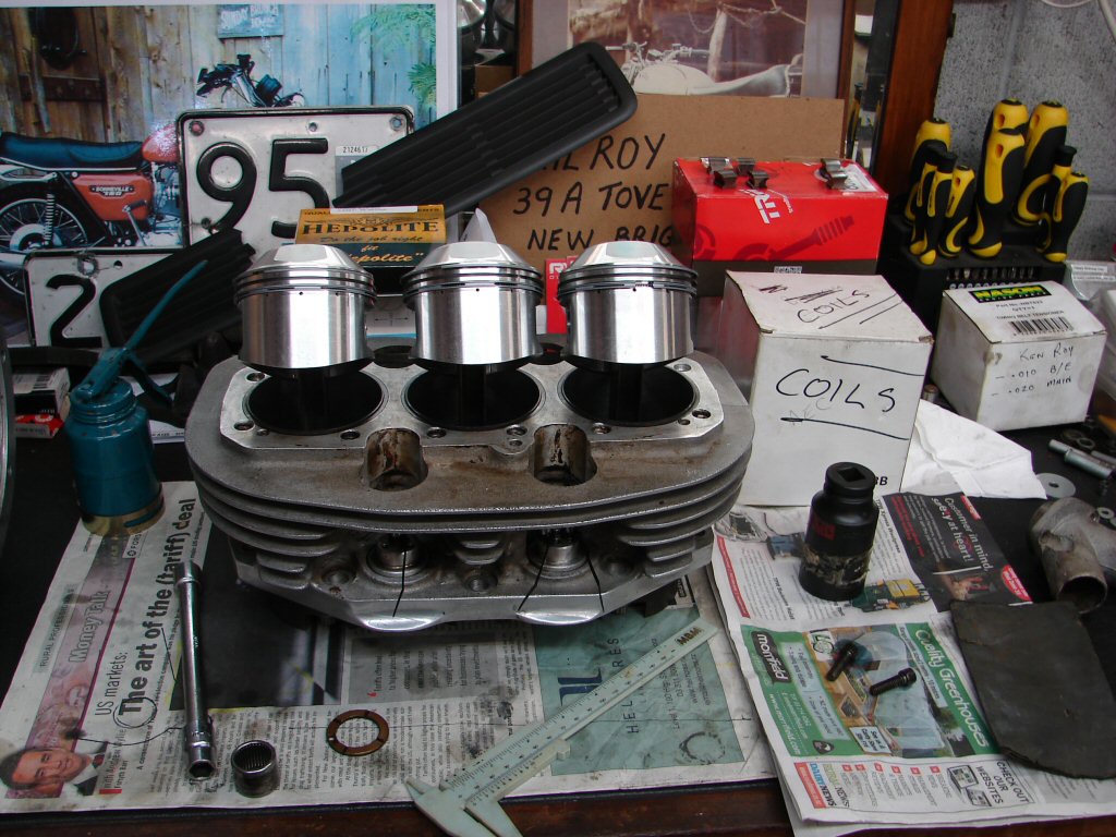 We now have two puzzles to solve. Will the bore clean up within the max oversize pistons we can acquire, and what pistons may they be. While Norman Hyde do stock oversize pistons for the 1000cc engine, I am reeling at the 600 pounds asking price for what are basically T120/TR6 pistons available locally for $270 a pair. Problem is - will their oil rings satisfy a Triple.