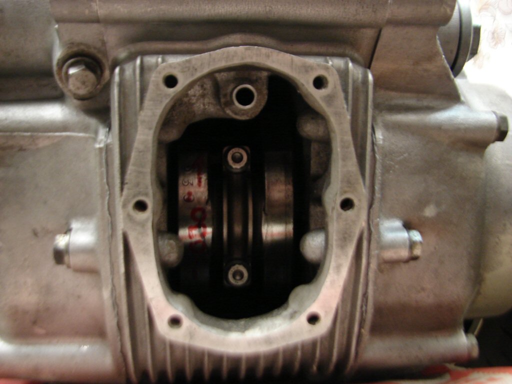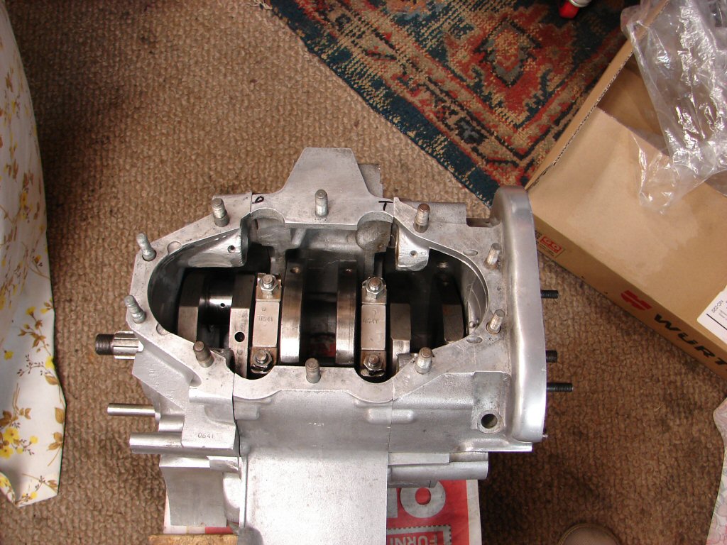 The centre conrod is just dangling between the crank webs for now, but once the cases are together and the barrels are fastened down, the centre rod gets torqued up via the hole where the sump plate fits.