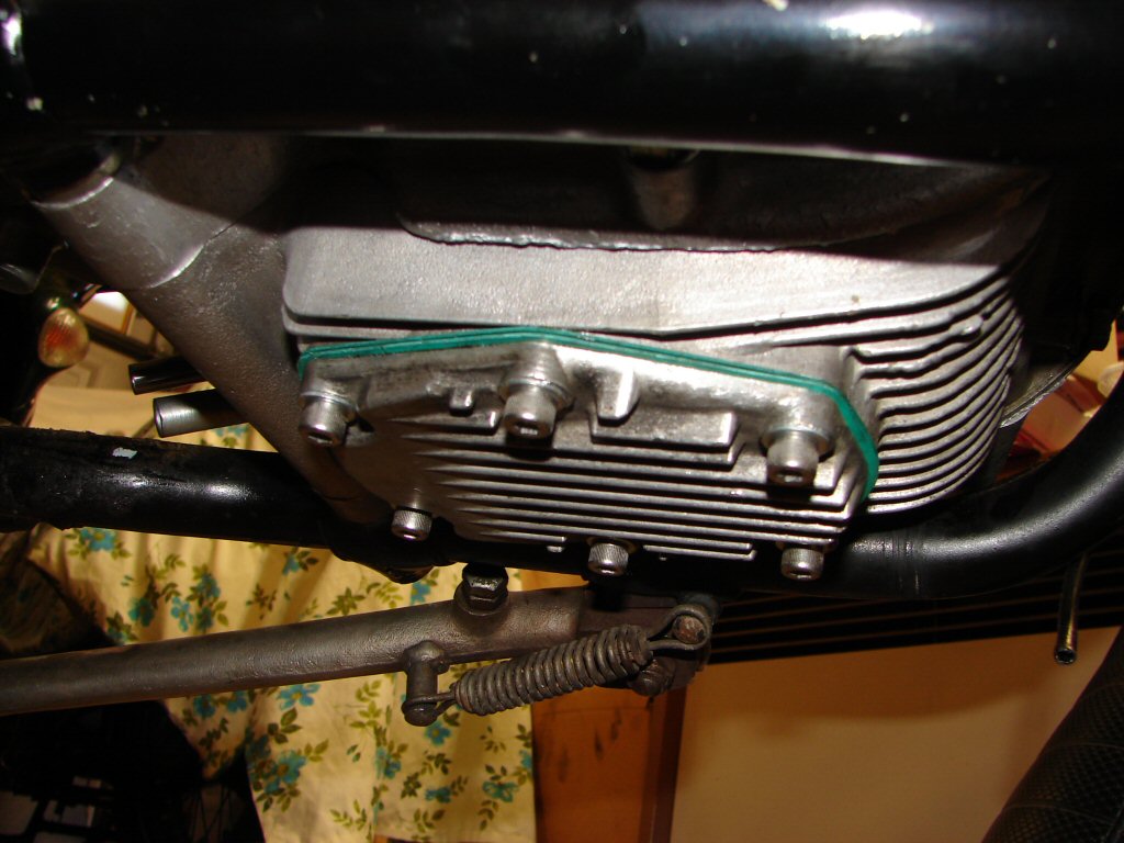 I only nip the fastening bolts up immediately after the case is fitted, to give the sealant a better go at curing a bit before giving them the full treatment, which I did several hours later. You can see the tiniest bead that has oozed from the joint down the rear edge, but as the outer case has a small protruding lip around its inner edge, nothing can find its way to the inside of the crankcase.