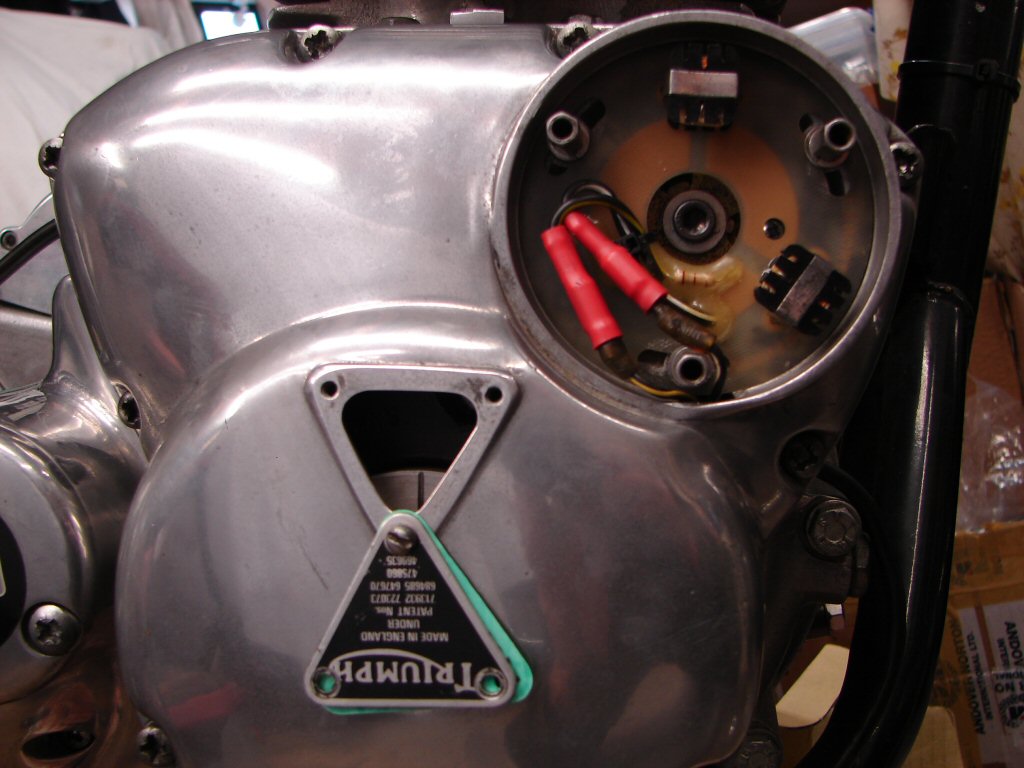Next step will be to fit and time the Boyer ignition pickup and run its wiring back to where the unit is located by the battery. The bike features an industrial type bridge rectifier - seen to the left of the kickstart lever - instead of the original finned Lucas job. This one had been suspended from the spring which once held the flasher unit, which I shall change. I had no less than three of these industrial types fail in relatively quick succession, despite adding a heat sink to the last two. They melt easily, and without being bolted to a reasonable piece of steel frame I can only imagine this one would be headed for the same fate. I refitted the old Lucas job to mine and have not had to visit it since. I put this particular popular modification into the "they say..." category, as the modern version is far less capable than the factory fitment, so once again - I think the factory got it right.