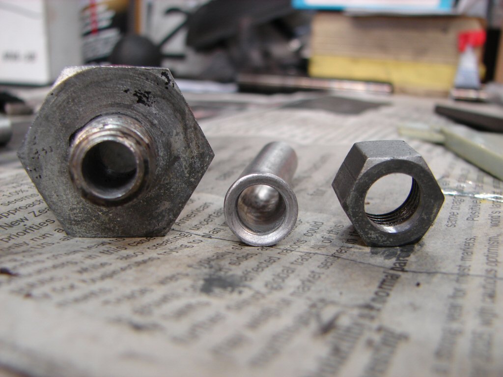 The tank oil filter had already had its outside cleaned before the drilling process began, then had another internal cleanup after four drill bits had passed through the boss in moderately quick succession. I then use another four drill bits to open up the nut, stepping up by 1/64" at a time, in order that things do not drift off centre, as there is absolutely no room left for errors.