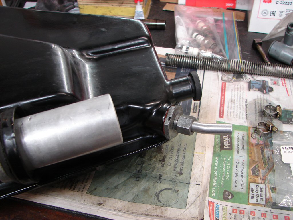 After waiting some days for the 'summer' rains to slow down a bit I was bracing myself for a pair of jobs I have a major aversion to. Cleaning a glittery oil tank and filter, plus modifying the oil tank feed to uprate the line size from 1/4" I.D. to 5/16". Because the T160 oil filter is unobtainium currently the existing T150 item has to have its delivery drilled out, and the retaining nut for the feed pipe - which is available - also drilled out to accept the larger pipe. While it is not too hard to drill the hole in the nut, the new feed pipe now has to have its flared end filed down in order to fit inside the threads of the nut. Its about the same fun level as gnawing your own arm off.