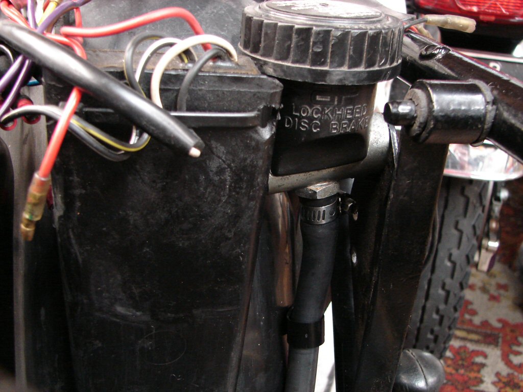 Checking the bike end of the equation reminded me that I had to replace the brake fluid line from the underseat reservoir to the rear brake cylinder before the oil tank got in the way, so I removed reservoir and line which was badly cracked at both ends. That might explain why there was no fluid in sight.