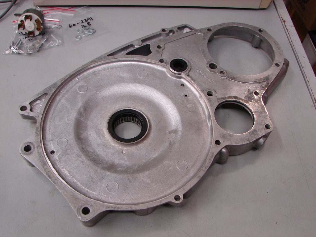 I had the cleaned up inner primary case ready to go, with its two new oil seals and the second big O ring for the oil pump sitting in its groove. Neither of the two needle roller bearings needed replacement, and were an excellent choice to have been a part of the original design brief. They do tremendous mileages with little wear, so long as they get their oil needs met.