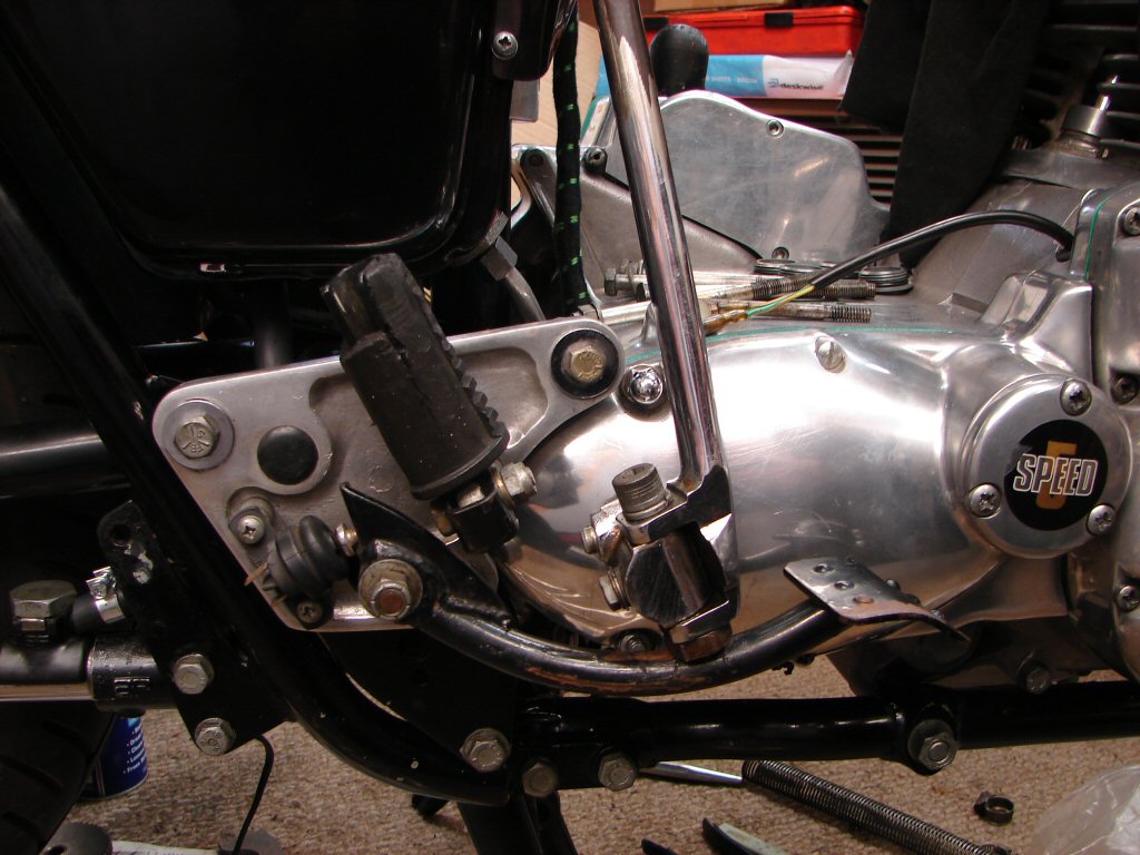 I repaired the rear brake light switch and adjusted the actuating screw, then a bit of rust treatment and a squirt or two of satin black got the pedal climate proof, plus a cleanup of the rear footrest mounting plate and that job is complete.