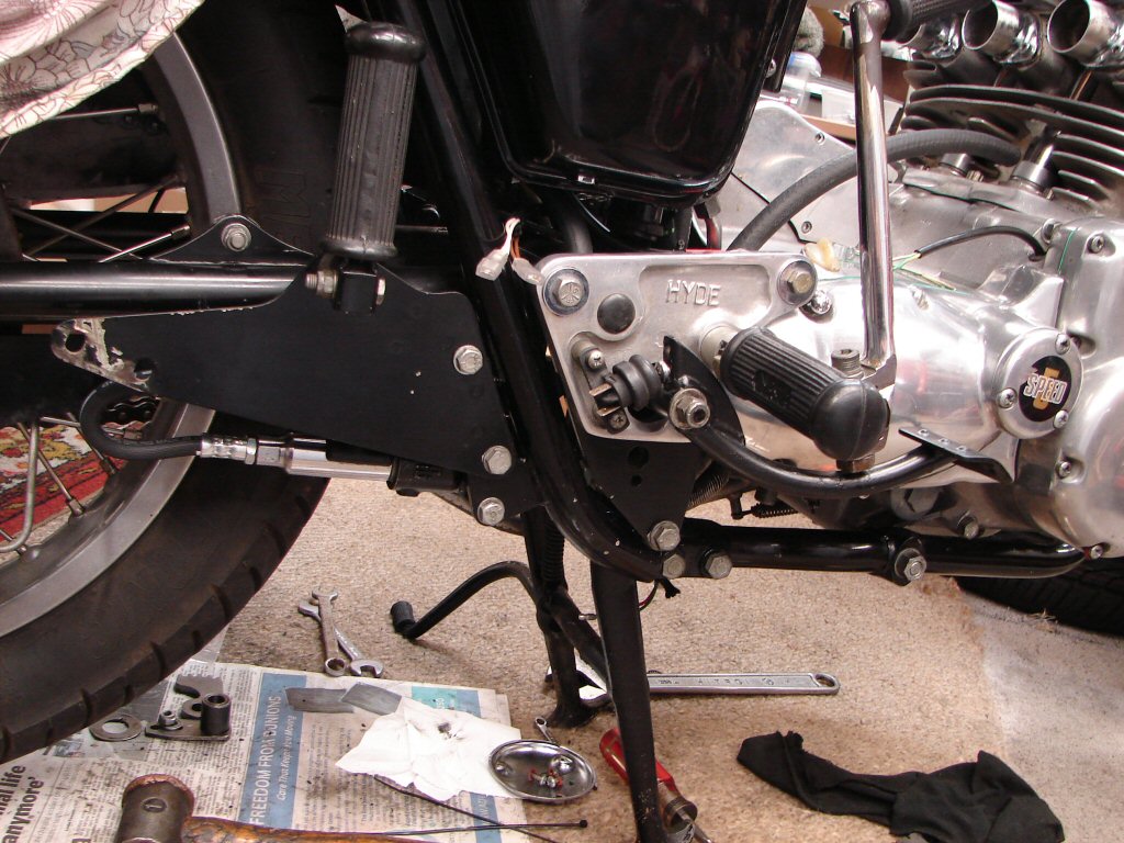 The footpeg rubbers are pretty much past their best-by and the brake lever could do with some paint, but otherwise everything on this side looks pretty workable. I had to pull it all off again after the first fit, as the peg was not tight enough and the head of its bolt is sandwiched between the Hyde setup and the original engine mounting plate.