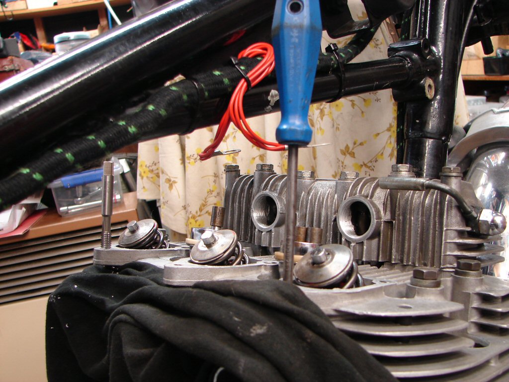 Next I chose to complete the cylinder head assembly, most of which was only to adjust the valve clearances. When in the first stages of this I fit the six allen screws along the front edges of the rocker boxes without their alloy washers. These are then fitted before the covers go on after valves are set.