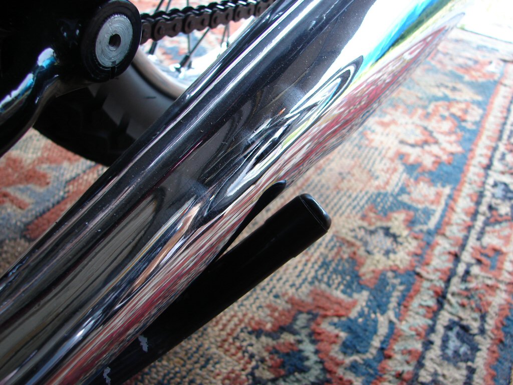 Footpeg rubber finally agreed to come off, so the peg got straightened. Checking for any fuel leaks I spotted a drip on the left carb banjo, so that got tightened. The side stand comes to rest against the left muffler, so I wrapped some insulation tape around the end of the stand then tightened the mounting bolt so that the stand tends to stay where you fold it to rather than annoy a valuable raygun muffler. They are increasingly hard to come by...