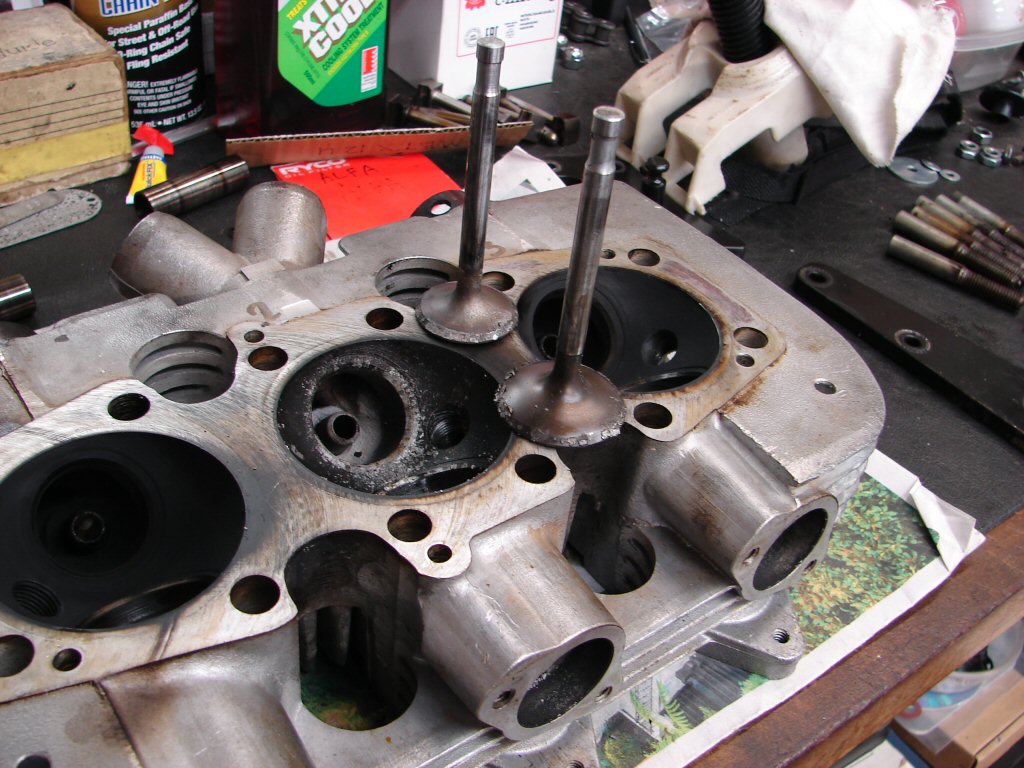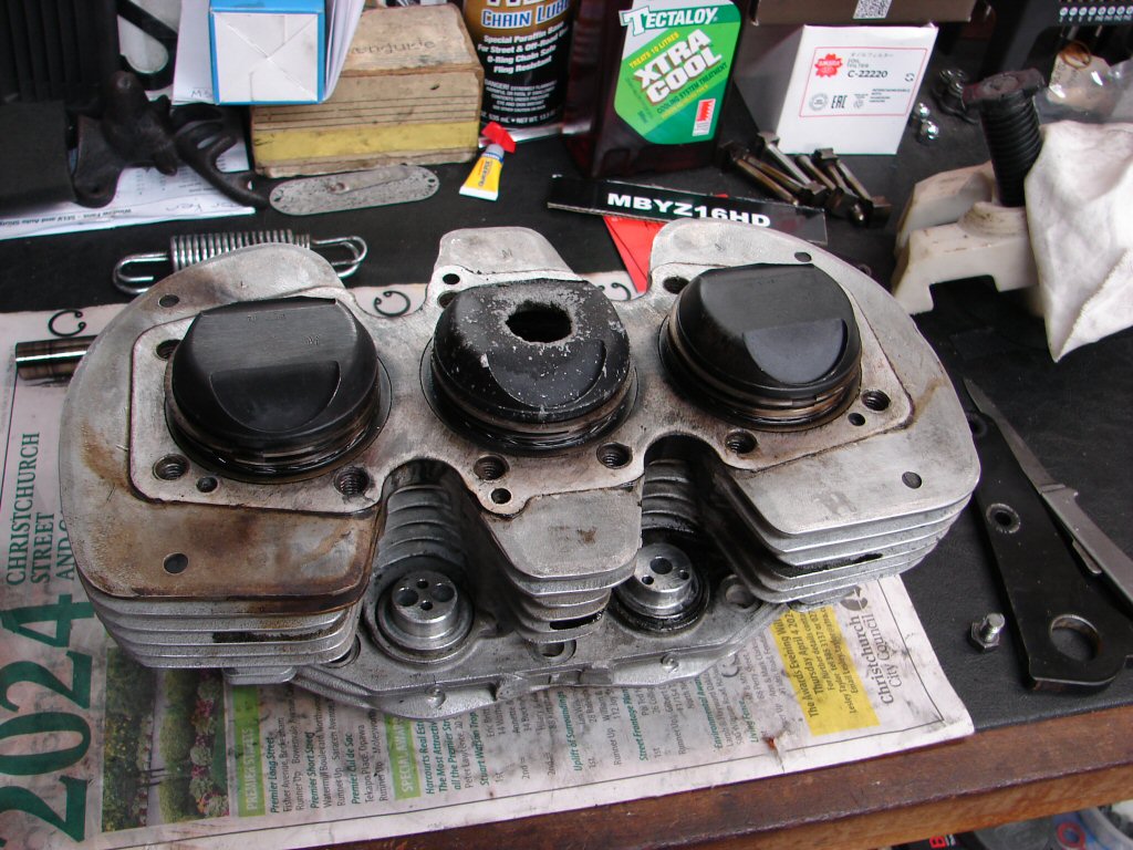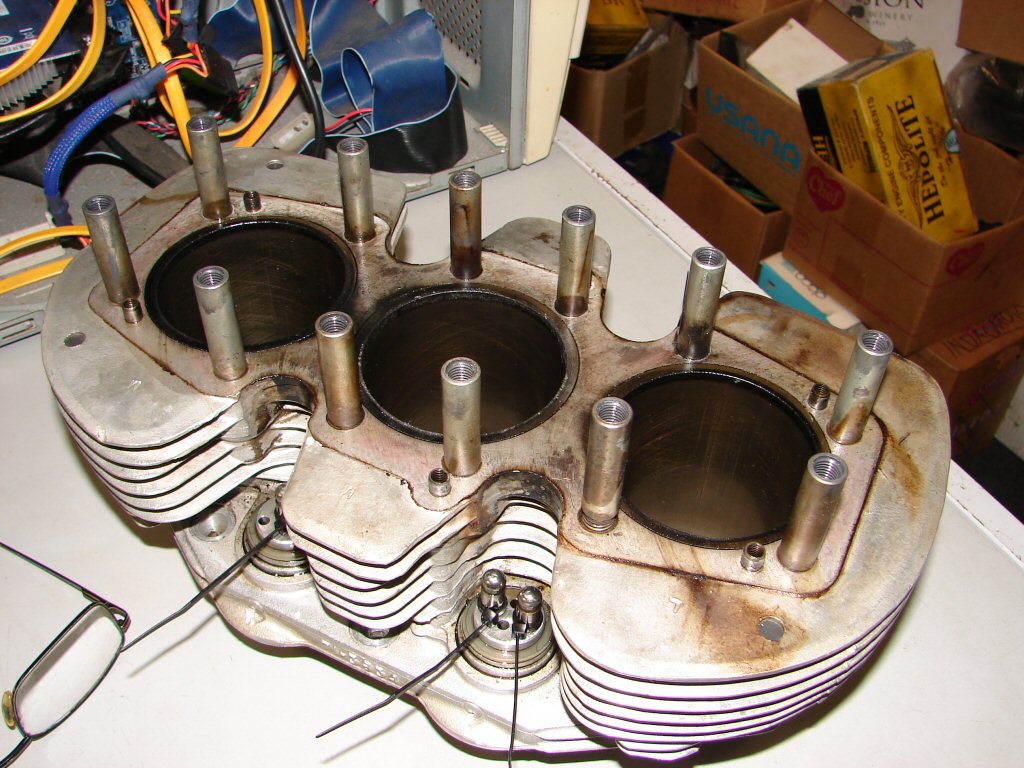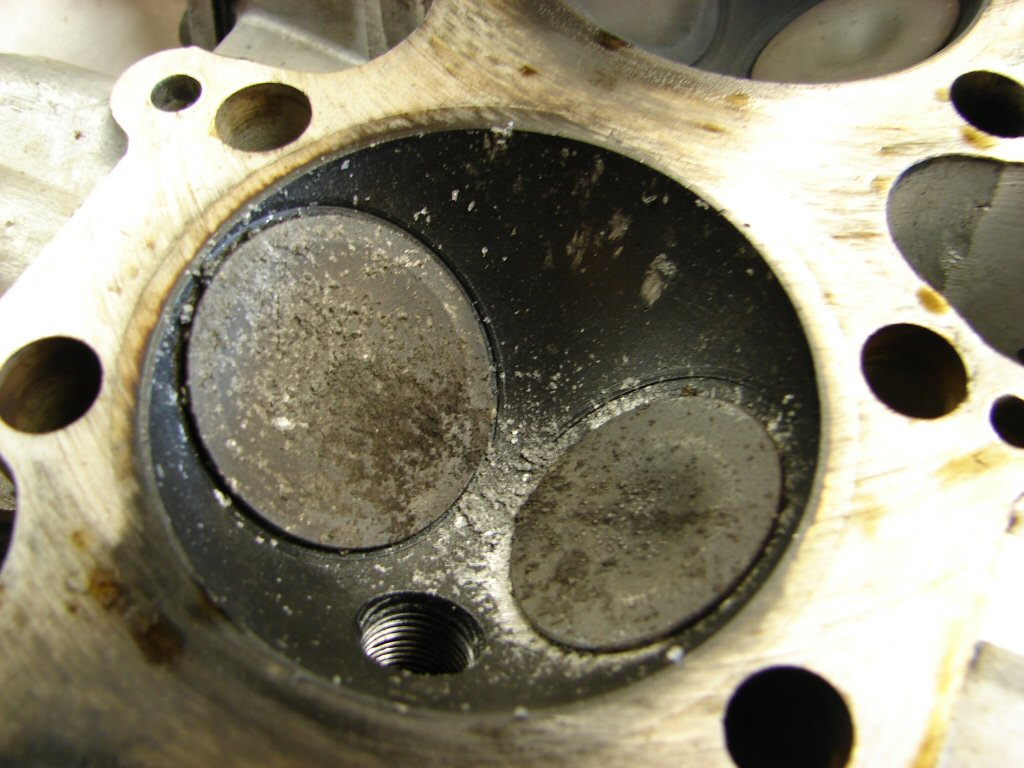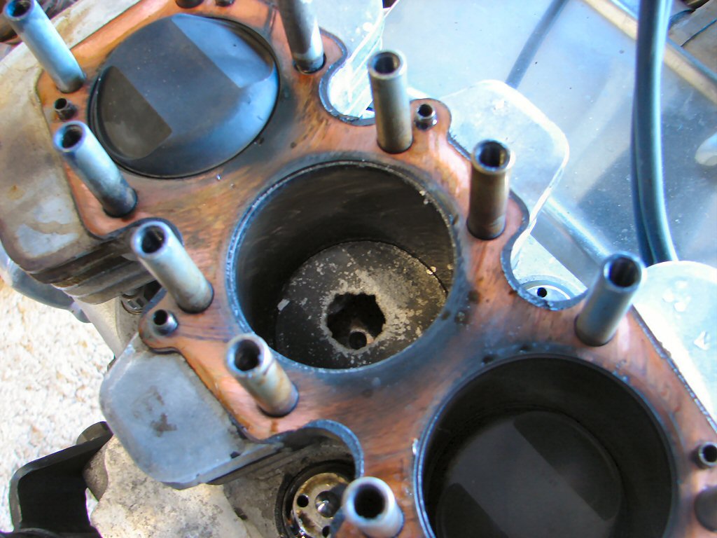 The two outer pistons got their tops cleaned and they are both factory originals, so if any were previously replaced it would have been early in the bike's history. I will take everything to Glen and see if he has any ideas as to what the cause could have been. I guess he sees a lot of air-cooled pistons...