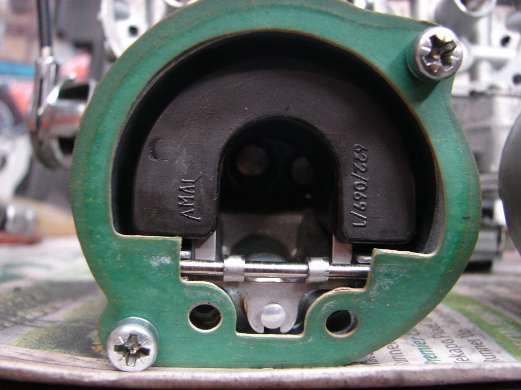 The float bowl gaskets are badly trimmed, such that the two flat edges at the lower sides protrude far enough into the float area that they collide with the lower edges (in this photo..) of the float, preventing it from rising far enough to completely operate the float needle. This would likely cause occasional unexplained flooding, so I can't blame it for melting a piston, but it was certainly problematic. They all got trimmed with a sharp blade.