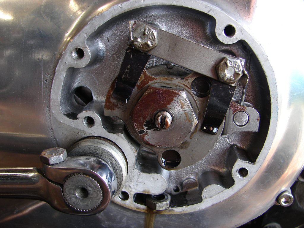 The primary cover was to be removed for several reasons. The clutch had become unadjustable of late, and I wanted to flush WD40 through the main bearing into the crankcase to displace any debris that may have travelled in this direction.