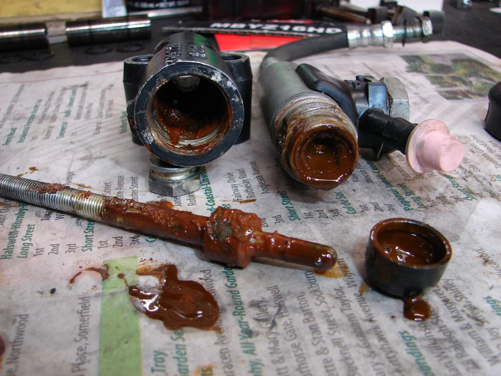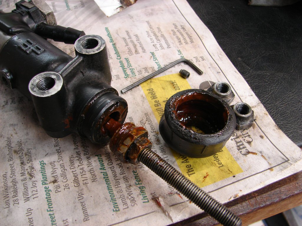Happily the master cylinder succumbed to the boiling water treatment and the housing unscrewed. I usually describe what lives inside these cylinders as 'tomato soup', and the resemblance is kinda self-evident.
