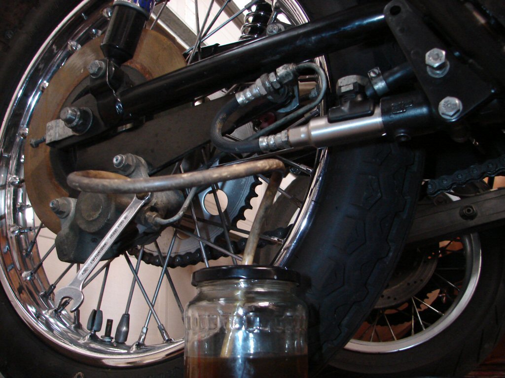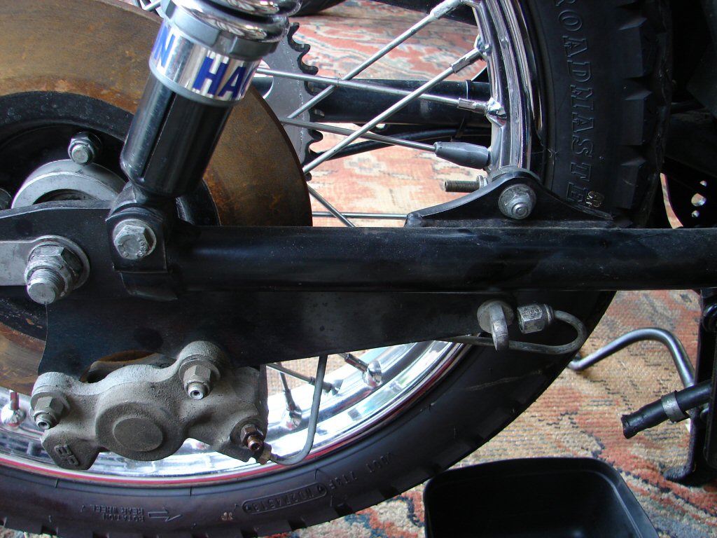'Anything else' showed up when I removed the flexible hose in order to remove the brake cylinder, to find that the swivelling functions of both the hose retainer and its mate which holds the brake anchor plate are seized solid, which means the rear wheel is sorta locked in place and explains why I met a bit of resistance when adjusting the rear chain.