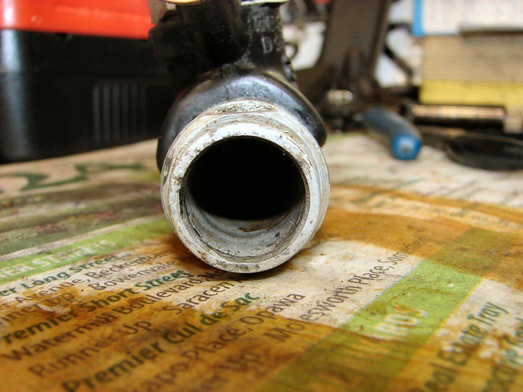 The tank filter cleaned up easily and was virtually free of anything looking like particles of alloy, or anything else for that matter. That reinforces the argument that the entire piston failure happened pretty quickly, but nothing promotes suspicion as to the guilty party. Apart from the slightly loose inlet stubs, the head gasket is the only part so far that looks like it was capable of causing trouble. The loose pillar stud would not have helped, but I am thinking that the gasket was not doing a proper job of sealing against the combustion gases, so maybe that got things started.